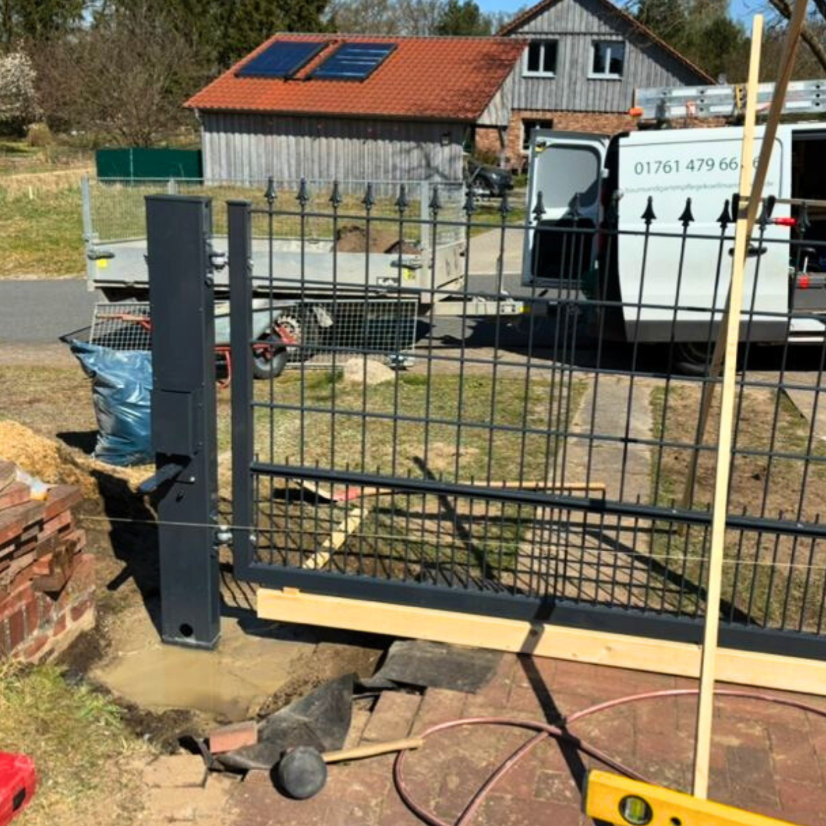 Die Pfosten werden ausgerichtet und einbetoniert. So steht das Gartentor fest, schließt zuverlässig und bleibt dauerhaft stabil.